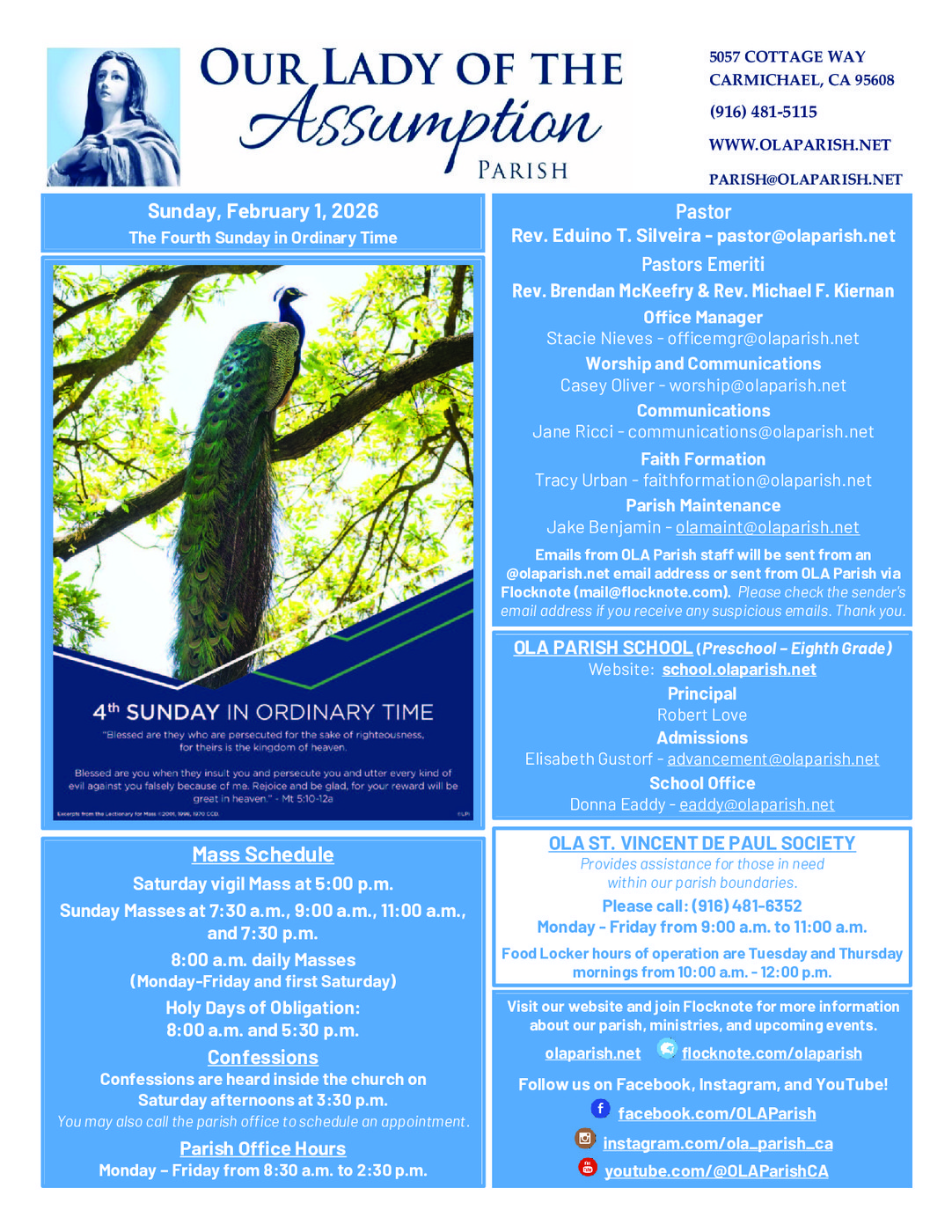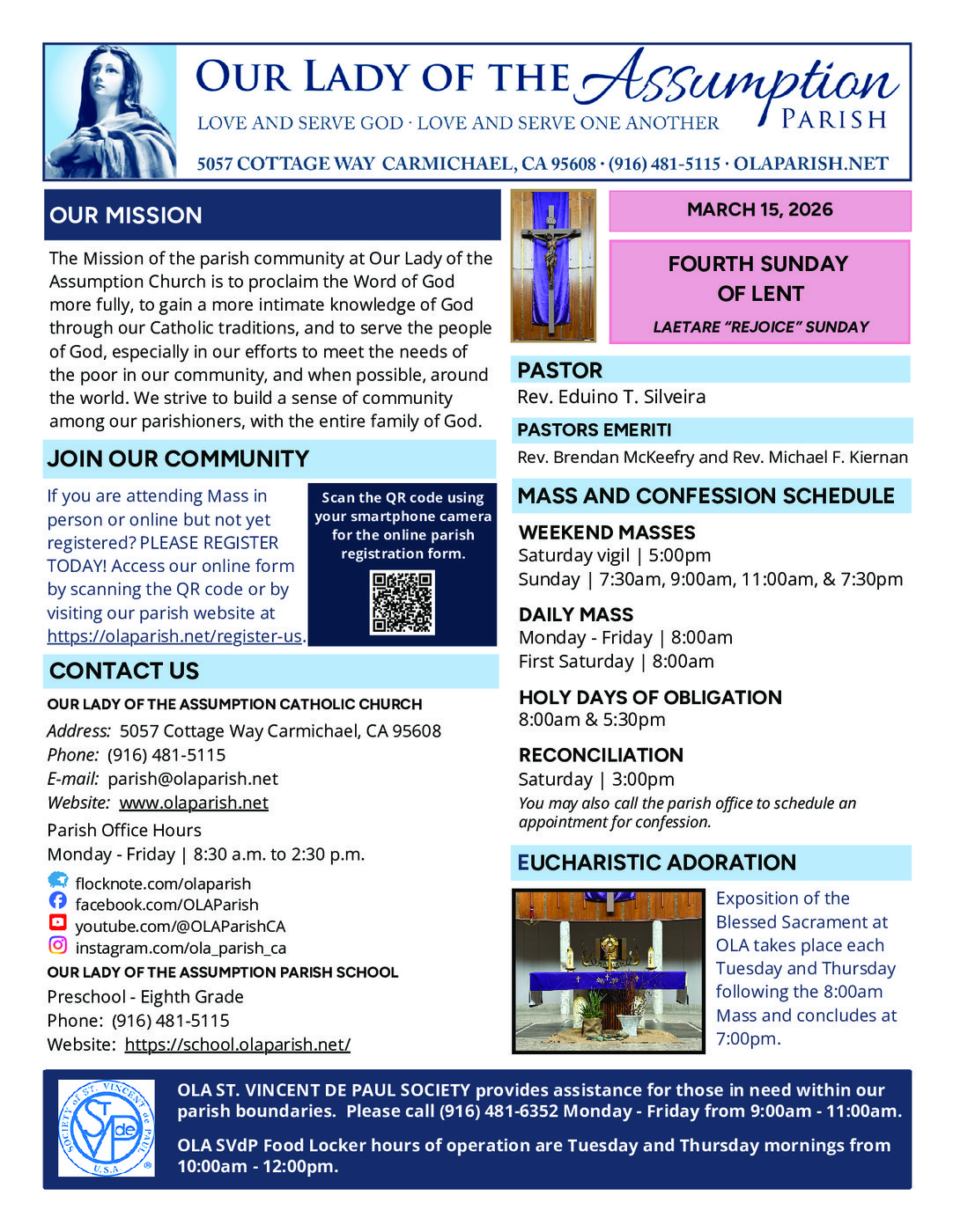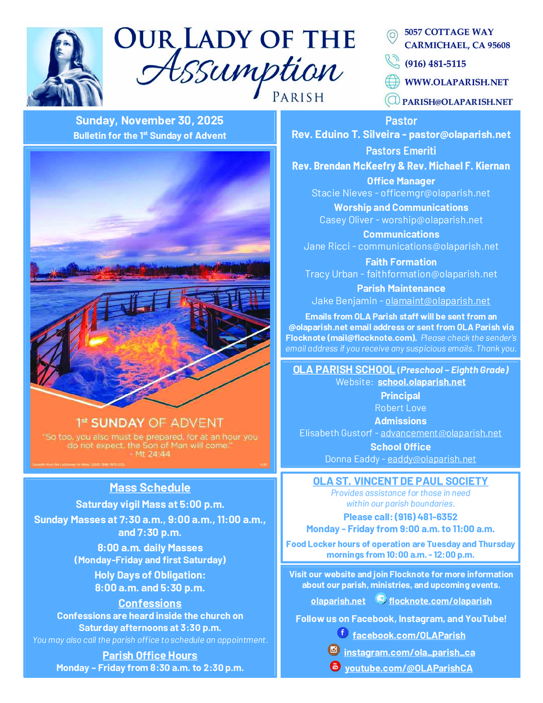 If you have an event to promote or news to share in our parish bulletin, please fill out the Communications Request Form on our parish website at https://olaparish.net/communications-committee. We will try to accomodate the dates you would prefer your item to appear. All communications requests are subject to approval by our pastor Father Eduino Silveira. For general questions or bulletin requests, you may also send an email to communications@olaparish.net.