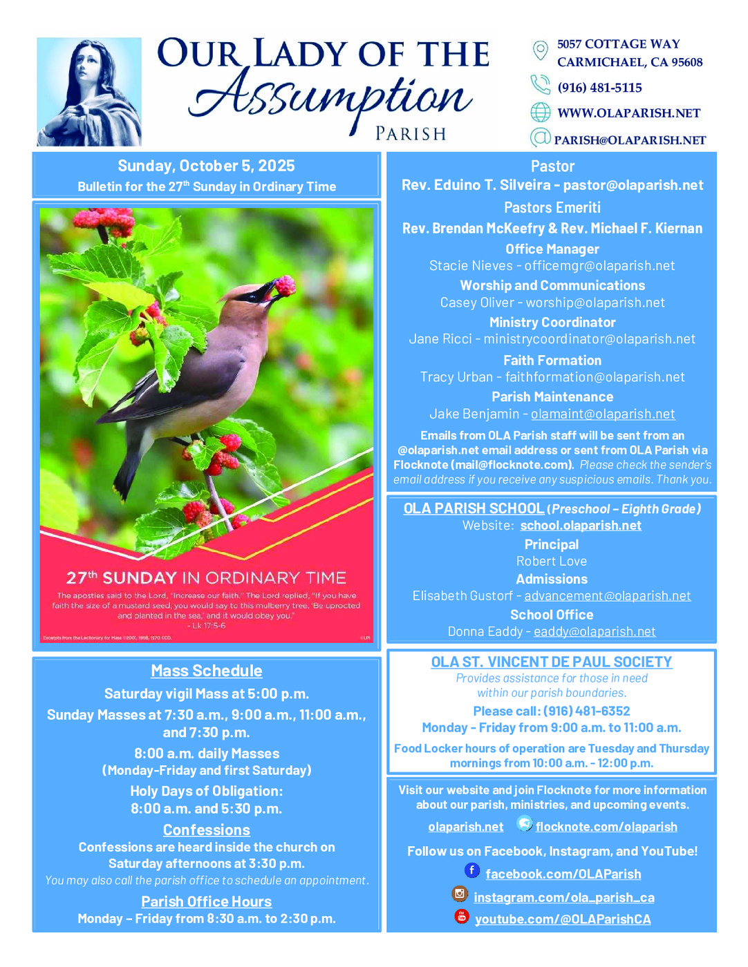 If you have an event to promote or news to share in our parish bulletin, please fill out the Communications Request Form on our parish website at https://olaparish.net/communications-committee.  We will try to accomodate the dates you would prefer your item to appear.  All communications requests are subject to approval by our pastor Father Eduino Silveira.  For general questions or bulletin requests, you may also send an email to communications@olaparish.net.