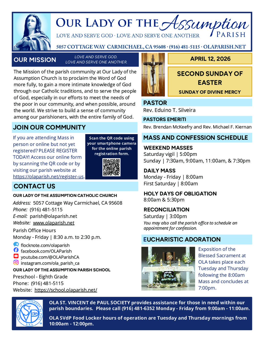 If you have an event to promote or news to share in our parish bulletin, please fill out the Communications Request Form on our parish website at https://olaparish.net/communications.  We will try to accomodate the dates you would prefer your item to appear.  All communications requests are subject to approval by our pastor Father Eduino Silveira.  For general questions or bulletin requests, you may also send an email to communications@olaparish.net.