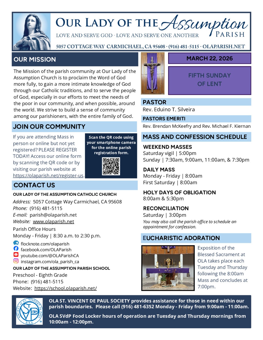 If you have an event to promote or news to share in our parish bulletin, please fill out the Communications Request Form on our parish website at https://olaparish.net/communications. We will try to accomodate the dates you would prefer your item to appear. All communications requests are subject to approval by our pastor Father Eduino Silveira. For general questions or bulletin requests, you may also send an email to communications@olaparish.net.
